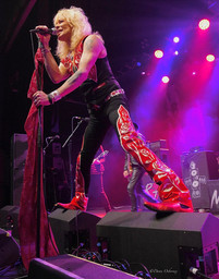 On ‘Don’t You Ever Leave Me’ Rich Jones did the speaking parts and sounded remarkably like Razzle did on the record. We all remember Monroe crying on the video for this song when Razzle’s death was still fresh. Now they celebrate his memory and Monroe ended the song with more splits. On the home straight the band picked up the pace again with ‘Boulevard Of Broken Dreams’ and ‘Ballad Of The Lower East Side’ (for which Monroe wears a black patent police hat). To roars from the crowd, they finished with ‘Malibu Beach Nightmare’ and ‘Up Around The Bend’, Monroe jumping from the drum riser.