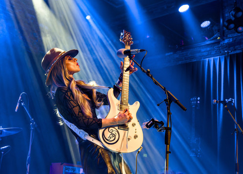 At 21.00, the intro music started, which I did not recognise, and Orianthi and her band took to the stage. She was dressed in a black leather skirt, black lacy top, boots, a red hat and shades, and looked very much the Rock star. She was playing her signature white PRS guitar with her logo in gold emblazoned on it, and behind her were her signature Orange amps. She opened with ‘First Time Blues’ from her latest album. The sound was excellent, and she immediately had the crowd in the palm of her hand. The other band members were Sam Collins on bass (Toby Lee band) and Demian Arriaga on drums from Los Angeles.